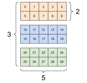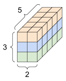 เทนเซอร์แบบ 3 แกน รูปร่าง: [3, 2, 5] | ||