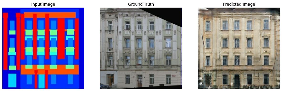 ด้านล่างนี้คือตัวอย่างบางส่วนของเอาต์พุตที่สร้างโดย pix2pix cGAN หลังจากการฝึกอบรม 200 ยุคในชุดข้อมูลด้านหน้า (80k ขั้นตอน)