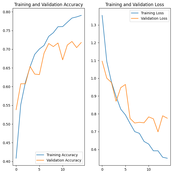 Dopo aver applicato l'aumento dei dati e tf.keras.layers.Dropout , c'è meno overfitting rispetto a prima e l'accuratezza della formazione e della convalida sono più allineate: