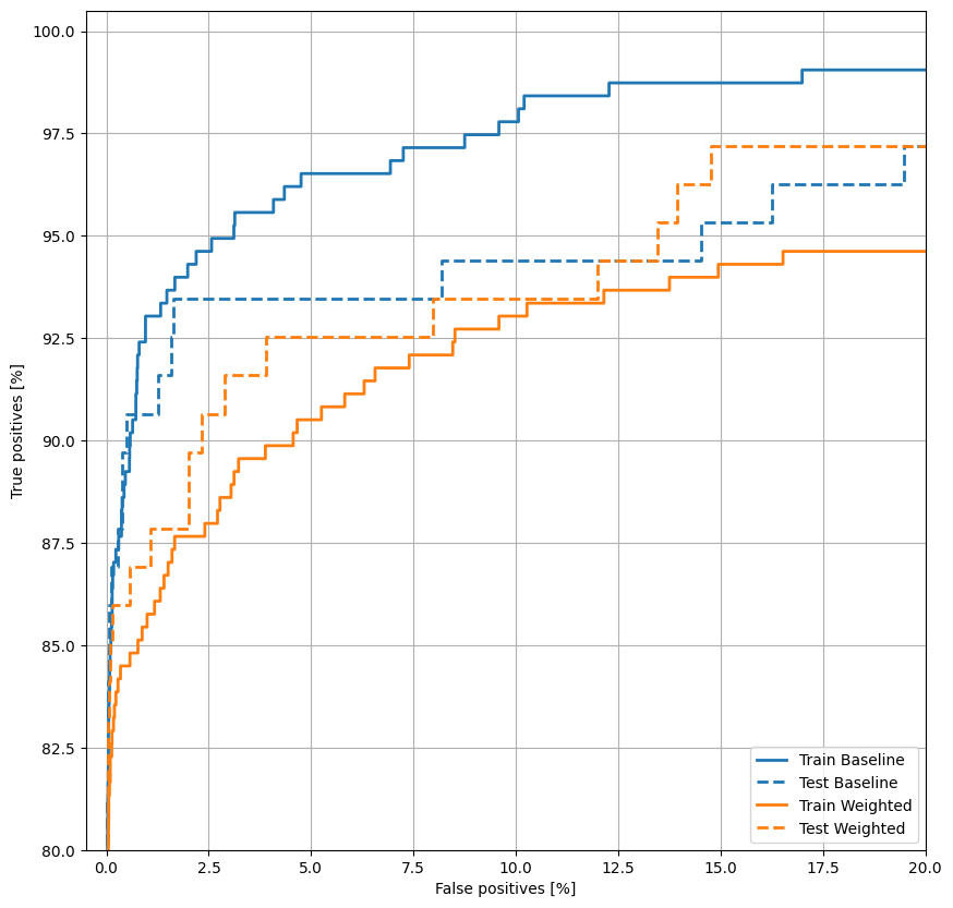 ในที่นี้คุณจะเห็นว่าเมื่อชั่งน้ำหนักในคลาสแล้ว ความแม่นยำและความแม่นยำจะลดลง เนื่องจากมีผลบวกที่ผิดพลาดมากกว่า แต่ในทางกลับกัน การเรียกคืนและ AUC จะสูงกว่า เนื่องจากแบบจำลองยังพบผลบวกที่เป็นจริงมากกว่าด้วย แม้จะมีความแม่นยำต่ำกว่า แต่โมเดลนี้มีการเรียกคืนสูงกว่า (และระบุธุรกรรมที่เป็นการฉ้อโกงมากกว่า) แน่นอน ข้อผิดพลาดทั้งสองประเภทมีค่าใช้จ่าย (คุณคงไม่อยากรบกวนผู้ใช้โดยตั้งค่าสถานะธุรกรรมที่ถูกกฎหมายมากเกินไปว่าเป็นการฉ้อโกง) พิจารณาอย่างรอบคอบถึงการประนีประนอมระหว่างข้อผิดพลาดประเภทต่างๆ เหล่านี้สำหรับแอปพลิเคชันของคุณ