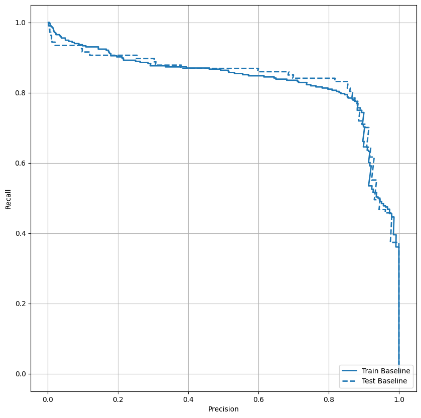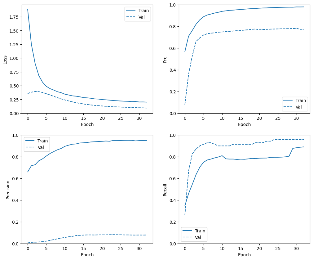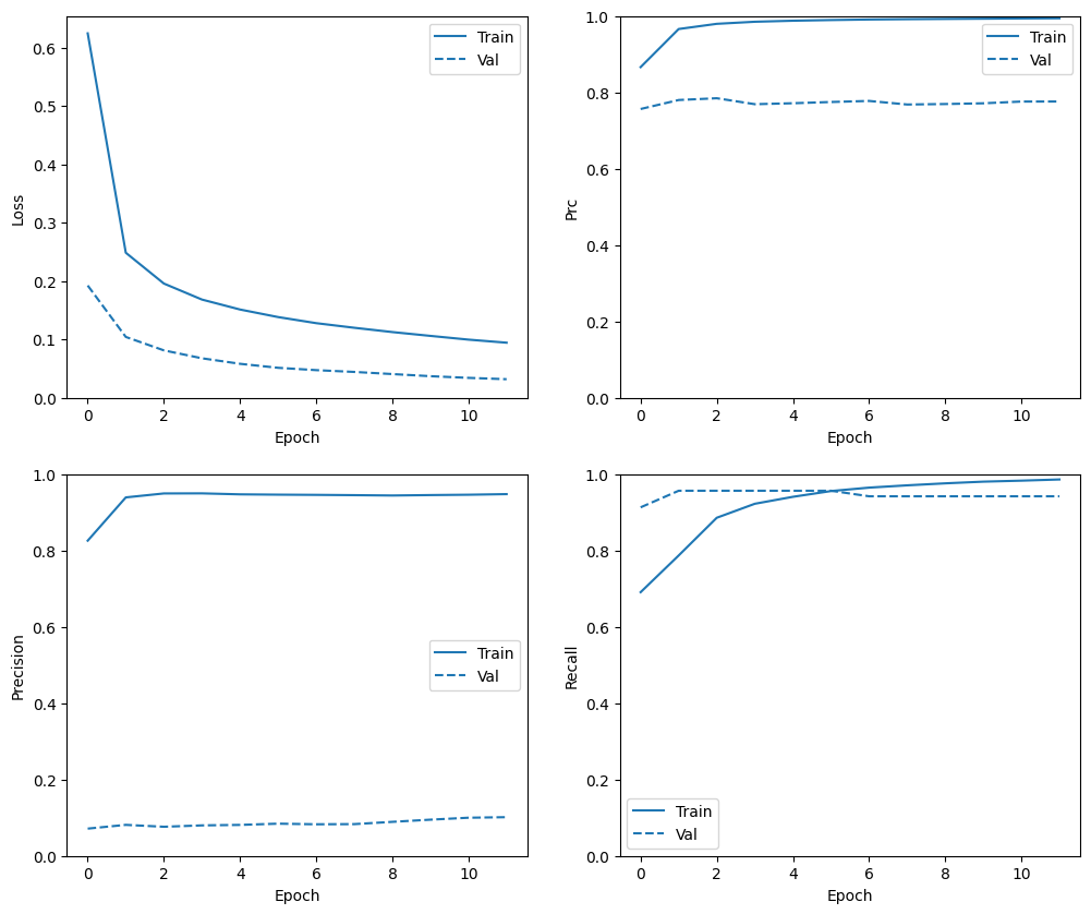 Epoch 1/100 278/278 [==============================] - 10s 32ms/step - loss: 0.5508 - tp: 214194.0000 - fp: 51114.0000 - tn: 290615.0000 - fn: 70383.0000 - accuracy: 0.8060 - precision: 0.8073 - recall: 0.7527 - auc: 0.8600 - prc: 0.8879 - val_loss: 0.2279 - val_tp: 73.0000 - val_fp: 969.0000 - val_tn: 44514.0000 - val_fn: 13.0000 - val_accuracy: 0.9785 - val_precision: 0.0701 - val_recall: 0.8488 - val_auc: 0.9551 - val_prc: 0.7044 Epoch 2/100 278/278 [==============================] - 8s 28ms/step - loss: 0.2235 - tp: 253877.0000 - fp: 15743.0000 - tn: 268530.0000 - fn: 31194.0000 - accuracy: 0.9176 - precision: 0.9416 - recall: 0.8906 - auc: 0.9658 - prc: 0.9746 - val_loss: 0.1367 - val_tp: 73.0000 - val_fp: 777.0000 - val_tn: 44706.0000 - val_fn: 13.0000 - val_accuracy: 0.9827 - val_precision: 0.0859 - val_recall: 0.8488 - val_auc: 0.9596 - val_prc: 0.7072 Epoch 3/100 278/278 [==============================] - 8s 28ms/step - loss: 0.1785 - tp: 258572.0000 - fp: 9840.0000 - tn: 274878.0000 - fn: 26054.0000 - accuracy: 0.9370 - precision: 0.9633 - recall: 0.9085 - auc: 0.9773 - prc: 0.9827 - val_loss: 0.1023 - val_tp: 72.0000 - val_fp: 699.0000 - val_tn: 44784.0000 - val_fn: 14.0000 - val_accuracy: 0.9844 - val_precision: 0.0934 - val_recall: 0.8372 - val_auc: 0.9632 - val_prc: 0.7032 Epoch 4/100 278/278 [==============================] - 8s 29ms/step - loss: 0.1571 - tp: 260447.0000 - fp: 8085.0000 - tn: 276389.0000 - fn: 24423.0000 - accuracy: 0.9429 - precision: 0.9699 - recall: 0.9143 - auc: 0.9826 - prc: 0.9863 - val_loss: 0.0869 - val_tp: 74.0000 - val_fp: 701.0000 - val_tn: 44782.0000 - val_fn: 12.0000 - val_accuracy: 0.9844 - val_precision: 0.0955 - val_recall: 0.8605 - val_auc: 0.9633 - val_prc: 0.6972 Epoch 5/100 278/278 [==============================] - 8s 30ms/step - loss: 0.1440 - tp: 261457.0000 - fp: 7449.0000 - tn: 277093.0000 - fn: 23345.0000 - accuracy: 0.9459 - precision: 0.9723 - recall: 0.9180 - auc: 0.9855 - prc: 0.9883 - val_loss: 0.0774 - val_tp: 73.0000 - val_fp: 679.0000 - val_tn: 44804.0000 - val_fn: 13.0000 - val_accuracy: 0.9848 - val_precision: 0.0971 - val_recall: 0.8488 - val_auc: 0.9645 - val_prc: 0.6971 Epoch 6/100 278/278 [==============================] - 8s 28ms/step - loss: 0.1349 - tp: 262460.0000 - fp: 6942.0000 - tn: 277723.0000 - fn: 22219.0000 - accuracy: 0.9488 - precision: 0.9742 - recall: 0.9220 - auc: 0.9876 - prc: 0.9896 - val_loss: 0.0718 - val_tp: 74.0000 - val_fp: 624.0000 - val_tn: 44859.0000 - val_fn: 12.0000 - val_accuracy: 0.9860 - val_precision: 0.1060 - val_recall: 0.8605 - val_auc: 0.9645 - val_prc: 0.6891 Epoch 7/100 278/278 [==============================] - 8s 28ms/step - loss: 0.1264 - tp: 263166.0000 - fp: 6780.0000 - tn: 278253.0000 - fn: 21145.0000 - accuracy: 0.9510 - precision: 0.9749 - recall: 0.9256 - auc: 0.9895 - prc: 0.9909 - val_loss: 0.0672 - val_tp: 75.0000 - val_fp: 602.0000 - val_tn: 44881.0000 - val_fn: 11.0000 - val_accuracy: 0.9865 - val_precision: 0.1108 - val_recall: 0.8721 - val_auc: 0.9670 - val_prc: 0.6822 Epoch 8/100 278/278 [==============================] - 8s 30ms/step - loss: 0.1190 - tp: 264216.0000 - fp: 6569.0000 - tn: 278270.0000 - fn: 20289.0000 - accuracy: 0.9528 - precision: 0.9757 - recall: 0.9287 - auc: 0.9910 - prc: 0.9920 - val_loss: 0.0628 - val_tp: 74.0000 - val_fp: 570.0000 - val_tn: 44913.0000 - val_fn: 12.0000 - val_accuracy: 0.9872 - val_precision: 0.1149 - val_recall: 0.8605 - val_auc: 0.9671 - val_prc: 0.6830 Epoch 9/100 278/278 [==============================] - 9s 31ms/step - loss: 0.1125 - tp: 264562.0000 - fp: 6339.0000 - tn: 279137.0000 - fn: 19306.0000 - accuracy: 0.9550 - precision: 0.9766 - recall: 0.9320 - auc: 0.9924 - prc: 0.9930 - val_loss: 0.0576 - val_tp: 74.0000 - val_fp: 544.0000 - val_tn: 44939.0000 - val_fn: 12.0000 - val_accuracy: 0.9878 - val_precision: 0.1197 - val_recall: 0.8605 - val_auc: 0.9672 - val_prc: 0.6828 Epoch 10/100 278/278 [==============================] - 8s 30ms/step - loss: 0.1064 - tp: 266549.0000 - fp: 6112.0000 - tn: 278323.0000 - fn: 18360.0000 - accuracy: 0.9570 - precision: 0.9776 - recall: 0.9356 - auc: 0.9934 - prc: 0.9937 - val_loss: 0.0544 - val_tp: 74.0000 - val_fp: 541.0000 - val_tn: 44942.0000 - val_fn: 12.0000 - val_accuracy: 0.9879 - val_precision: 0.1203 - val_recall: 0.8605 - val_auc: 0.9638 - val_prc: 0.6827 Epoch 11/100 278/278 [==============================] - 8s 30ms/step - loss: 0.1005 - tp: 267048.0000 - fp: 6123.0000 - tn: 278896.0000 - fn: 17277.0000 - accuracy: 0.9589 - precision: 0.9776 - recall: 0.9392 - auc: 0.9943 - prc: 0.9944 - val_loss: 0.0493 - val_tp: 74.0000 - val_fp: 500.0000 - val_tn: 44983.0000 - val_fn: 12.0000 - val_accuracy: 0.9888 - val_precision: 0.1289 - val_recall: 0.8605 - val_auc: 0.9578 - val_prc: 0.6761 Epoch 12/100 277/278 [============================>.] - ETA: 0s - loss: 0.0950 - tp: 266855.0000 - fp: 6079.0000 - tn: 277677.0000 - fn: 16685.0000 - accuracy: 0.9599 - precision: 0.9777 - recall: 0.9412 - auc: 0.9950 - prc: 0.9949Restoring model weights from the end of the best epoch: 2. 278/278 [==============================] - 8s 29ms/step - loss: 0.0950 - tp: 267815.0000 - fp: 6094.0000 - tn: 278693.0000 - fn: 16742.0000 - accuracy: 0.9599 - precision: 0.9778 - recall: 0.9412 - auc: 0.9950 - prc: 0.9949 - val_loss: 0.0451 - val_tp: 74.0000 - val_fp: 468.0000 - val_tn: 45015.0000 - val_fn: 12.0000 - val_accuracy: 0.9895 - val_precision: 0.1365 - val_recall: 0.8605 - val_auc: 0.9581 - val_prc: 0.6683 Epoch 12: early stopping