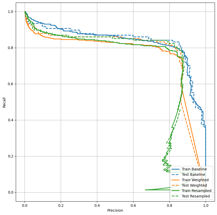 ตอนนี้ ให้ลองฝึกโมเดลด้วยชุดข้อมูลที่สุ่มตัวอย่างใหม่ แทนที่จะใช้น้ำหนักของคลาส เพื่อดูว่าเมธอดเหล่านี้เปรียบเทียบกันอย่างไร