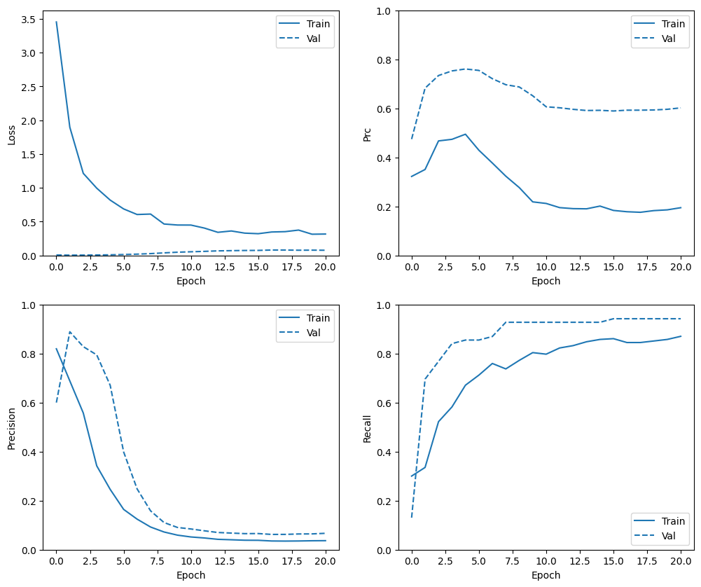 Epoch 1/1000 20/20 [==============================] - 3s 73ms/step - loss: 2.0114 - tp: 3382.0000 - fp: 5181.0000 - tn: 60589.0000 - fn: 17377.0000 - accuracy: 0.7393 - precision: 0.3950 - recall: 0.1629 - auc: 0.6308 - prc: 0.3325 - val_loss: 0.4343 - val_tp: 7.0000 - val_fp: 5042.0000 - val_tn: 40441.0000 - val_fn: 79.0000 - val_accuracy: 0.8876 - val_precision: 0.0014 - val_recall: 0.0814 - val_auc: 0.2282 - val_prc: 0.0012 Epoch 2/1000 20/20 [==============================] - 1s 33ms/step - loss: 1.2163 - tp: 7466.0000 - fp: 5137.0000 - tn: 15257.0000 - fn: 13100.0000 - accuracy: 0.5548 - precision: 0.5924 - recall: 0.3630 - auc: 0.4763 - prc: 0.5716 - val_loss: 0.4539 - val_tp: 36.0000 - val_fp: 5893.0000 - val_tn: 39590.0000 - val_fn: 50.0000 - val_accuracy: 0.8696 - val_precision: 0.0061 - val_recall: 0.4186 - val_auc: 0.6494 - val_prc: 0.0054 Epoch 3/1000 20/20 [==============================] - 1s 33ms/step - loss: 0.7406 - tp: 12289.0000 - fp: 5509.0000 - tn: 14872.0000 - fn: 8290.0000 - accuracy: 0.6631 - precision: 0.6905 - recall: 0.5972 - auc: 0.6803 - prc: 0.7580 - val_loss: 0.4611 - val_tp: 75.0000 - val_fp: 6273.0000 - val_tn: 39210.0000 - val_fn: 11.0000 - val_accuracy: 0.8621 - val_precision: 0.0118 - val_recall: 0.8721 - val_auc: 0.9293 - val_prc: 0.4539 Epoch 4/1000 20/20 [==============================] - 1s 33ms/step - loss: 0.5071 - tp: 15891.0000 - fp: 5370.0000 - tn: 15013.0000 - fn: 4686.0000 - accuracy: 0.7545 - precision: 0.7474 - recall: 0.7723 - auc: 0.8298 - prc: 0.8757 - val_loss: 0.4451 - val_tp: 78.0000 - val_fp: 5505.0000 - val_tn: 39978.0000 - val_fn: 8.0000 - val_accuracy: 0.8790 - val_precision: 0.0140 - val_recall: 0.9070 - val_auc: 0.9443 - val_prc: 0.6777 Epoch 5/1000 20/20 [==============================] - 1s 34ms/step - loss: 0.4284 - tp: 17046.0000 - fp: 5072.0000 - tn: 15496.0000 - fn: 3346.0000 - accuracy: 0.7945 - precision: 0.7707 - recall: 0.8359 - auc: 0.8827 - prc: 0.9151 - val_loss: 0.4140 - val_tp: 77.0000 - val_fp: 4338.0000 - val_tn: 41145.0000 - val_fn: 9.0000 - val_accuracy: 0.9046 - val_precision: 0.0174 - val_recall: 0.8953 - val_auc: 0.9463 - val_prc: 0.6903 Epoch 6/1000 20/20 [==============================] - 1s 33ms/step - loss: 0.3836 - tp: 17606.0000 - fp: 4362.0000 - tn: 16113.0000 - fn: 2879.0000 - accuracy: 0.8232 - precision: 0.8014 - recall: 0.8595 - auc: 0.9080 - prc: 0.9336 - val_loss: 0.3824 - val_tp: 77.0000 - val_fp: 3314.0000 - val_tn: 42169.0000 - val_fn: 9.0000 - val_accuracy: 0.9271 - val_precision: 0.0227 - val_recall: 0.8953 - val_auc: 0.9475 - val_prc: 0.6752 Epoch 7/1000 20/20 [==============================] - 1s 34ms/step - loss: 0.3574 - tp: 17856.0000 - fp: 3894.0000 - tn: 16553.0000 - fn: 2657.0000 - accuracy: 0.8401 - precision: 0.8210 - recall: 0.8705 - auc: 0.9208 - prc: 0.9432 - val_loss: 0.3538 - val_tp: 76.0000 - val_fp: 2592.0000 - val_tn: 42891.0000 - val_fn: 10.0000 - val_accuracy: 0.9429 - val_precision: 0.0285 - val_recall: 0.8837 - val_auc: 0.9486 - val_prc: 0.6819 Epoch 8/1000 20/20 [==============================] - 1s 34ms/step - loss: 0.3377 - tp: 17766.0000 - fp: 3483.0000 - tn: 17067.0000 - fn: 2644.0000 - accuracy: 0.8504 - precision: 0.8361 - recall: 0.8705 - auc: 0.9280 - prc: 0.9481 - val_loss: 0.3271 - val_tp: 76.0000 - val_fp: 2047.0000 - val_tn: 43436.0000 - val_fn: 10.0000 - val_accuracy: 0.9549 - val_precision: 0.0358 - val_recall: 0.8837 - val_auc: 0.9497 - val_prc: 0.6910 Epoch 9/1000 20/20 [==============================] - 1s 34ms/step - loss: 0.3188 - tp: 17749.0000 - fp: 2855.0000 - tn: 17547.0000 - fn: 2809.0000 - accuracy: 0.8617 - precision: 0.8614 - recall: 0.8634 - auc: 0.9360 - prc: 0.9539 - val_loss: 0.3051 - val_tp: 74.0000 - val_fp: 1657.0000 - val_tn: 43826.0000 - val_fn: 12.0000 - val_accuracy: 0.9634 - val_precision: 0.0427 - val_recall: 0.8605 - val_auc: 0.9514 - val_prc: 0.7022 Epoch 10/1000 20/20 [==============================] - 1s 33ms/step - loss: 0.3046 - tp: 17772.0000 - fp: 2599.0000 - tn: 17841.0000 - fn: 2748.0000 - accuracy: 0.8695 - precision: 0.8724 - recall: 0.8661 - auc: 0.9402 - prc: 0.9570 - val_loss: 0.2860 - val_tp: 74.0000 - val_fp: 1398.0000 - val_tn: 44085.0000 - val_fn: 12.0000 - val_accuracy: 0.9691 - val_precision: 0.0503 - val_recall: 0.8605 - val_auc: 0.9527 - val_prc: 0.6997 Epoch 11/1000 20/20 [==============================] - 1s 34ms/step - loss: 0.2937 - tp: 17673.0000 - fp: 2352.0000 - tn: 18273.0000 - fn: 2662.0000 - accuracy: 0.8776 - precision: 0.8825 - recall: 0.8691 - auc: 0.9447 - prc: 0.9595 - val_loss: 0.2687 - val_tp: 73.0000 - val_fp: 1235.0000 - val_tn: 44248.0000 - val_fn: 13.0000 - val_accuracy: 0.9726 - val_precision: 0.0558 - val_recall: 0.8488 - val_auc: 0.9534 - val_prc: 0.7066 Epoch 12/1000 20/20 [==============================] - 1s 34ms/step - loss: 0.2813 - tp: 17721.0000 - fp: 2109.0000 - tn: 18523.0000 - fn: 2607.0000 - accuracy: 0.8849 - precision: 0.8936 - recall: 0.8718 - auc: 0.9485 - prc: 0.9621 - val_loss: 0.2524 - val_tp: 73.0000 - val_fp: 1098.0000 - val_tn: 44385.0000 - val_fn: 13.0000 - val_accuracy: 0.9756 - val_precision: 0.0623 - val_recall: 0.8488 - val_auc: 0.9539 - val_prc: 0.7094 Epoch 13/1000 20/20 [==============================] - 1s 36ms/step - loss: 0.2706 - tp: 18031.0000 - fp: 1869.0000 - tn: 18502.0000 - fn: 2558.0000 - accuracy: 0.8919 - precision: 0.9061 - recall: 0.8758 - auc: 0.9520 - prc: 0.9652 - val_loss: 0.2395 - val_tp: 73.0000 - val_fp: 1037.0000 - val_tn: 44446.0000 - val_fn: 13.0000 - val_accuracy: 0.9770 - val_precision: 0.0658 - val_recall: 0.8488 - val_auc: 0.9549 - val_prc: 0.7119 Epoch 14/1000 20/20 [==============================] - 1s 37ms/step - loss: 0.2665 - tp: 18087.0000 - fp: 1748.0000 - tn: 18567.0000 - fn: 2558.0000 - accuracy: 0.8949 - precision: 0.9119 - recall: 0.8761 - auc: 0.9525 - prc: 0.9661 - val_loss: 0.2283 - val_tp: 73.0000 - val_fp: 972.0000 - val_tn: 44511.0000 - val_fn: 13.0000 - val_accuracy: 0.9784 - val_precision: 0.0699 - val_rec